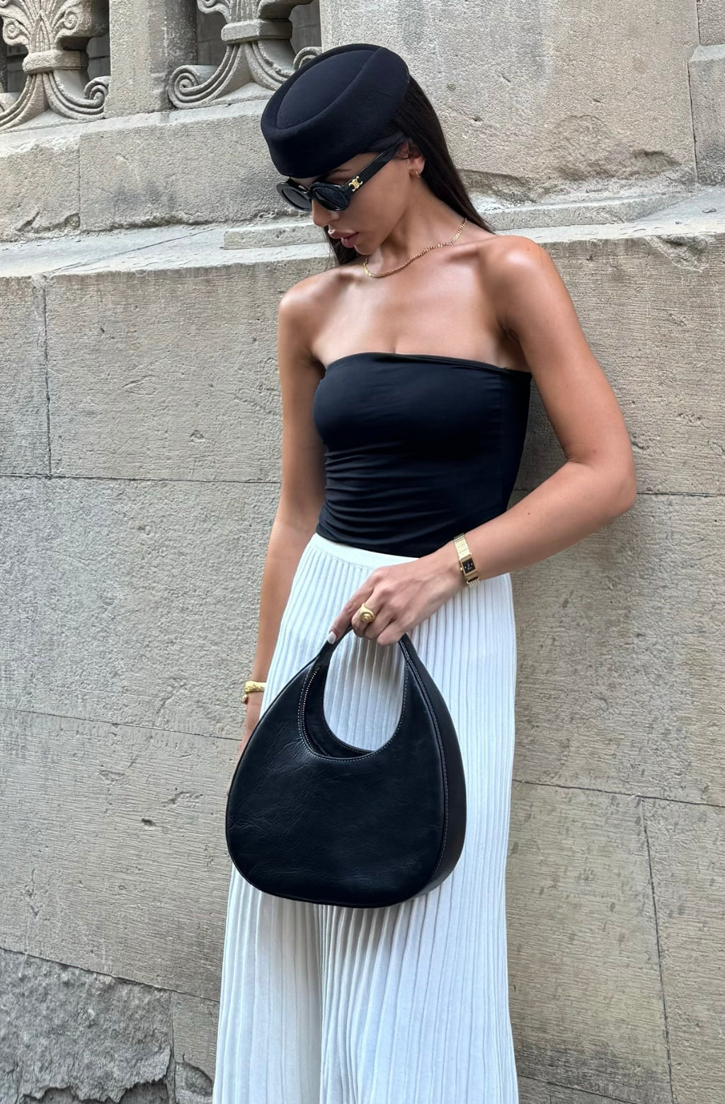 Presentamos el bolso de mano de cuero «The Moonstone», un accesorio de inspiración celestial que captura la esencia de la elegancia atemporal. Elaborado con precisión, su forma pequeña y redondeada evoca una belleza tranquila, mientras que el asa redonda añade un toque de gracia. Diseñado para ser acunado en el brazo con su tamaño compacto, emana un aura de sofisticación sin esfuerzo. El cierre de cremallera garantiza que sus pertenencias estén bien guardadas, mientras que el diseño minimalista y elegante dice mucho del gusto refinado. Adornado con el logotipo de Time Resistance en el asa, es un símbolo de calidad artesanal y estilo perdurable. Ilumine su apariencia con el bolso de mano «The», una encarnación del encanto celestial y el refinamiento discreto.