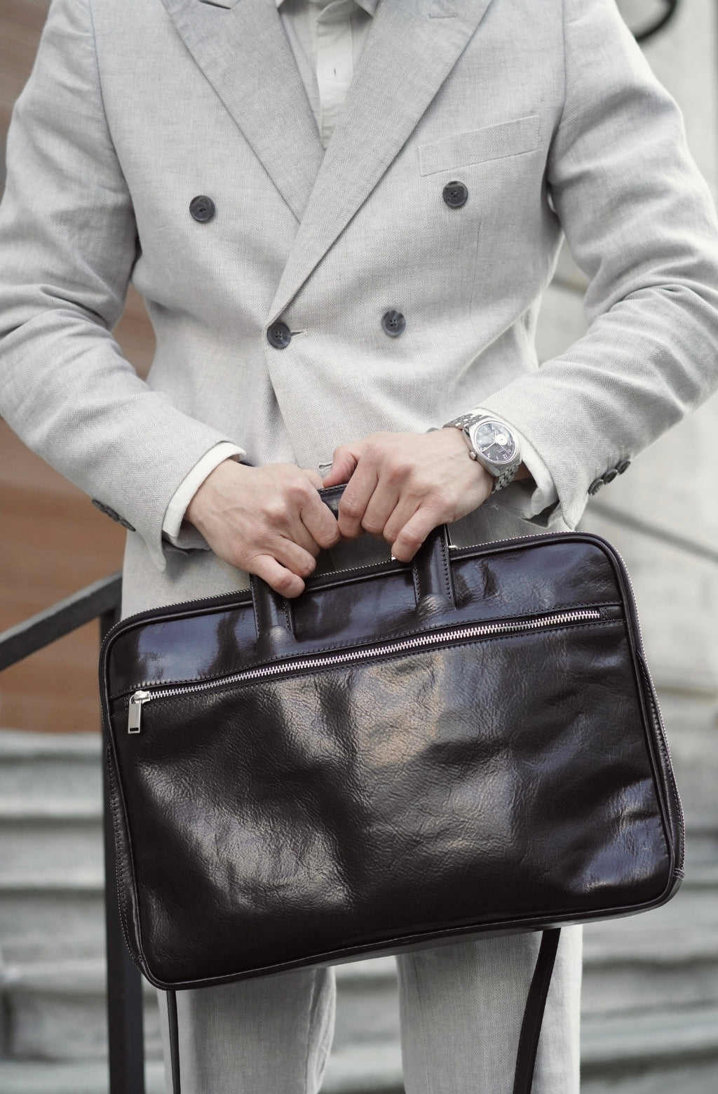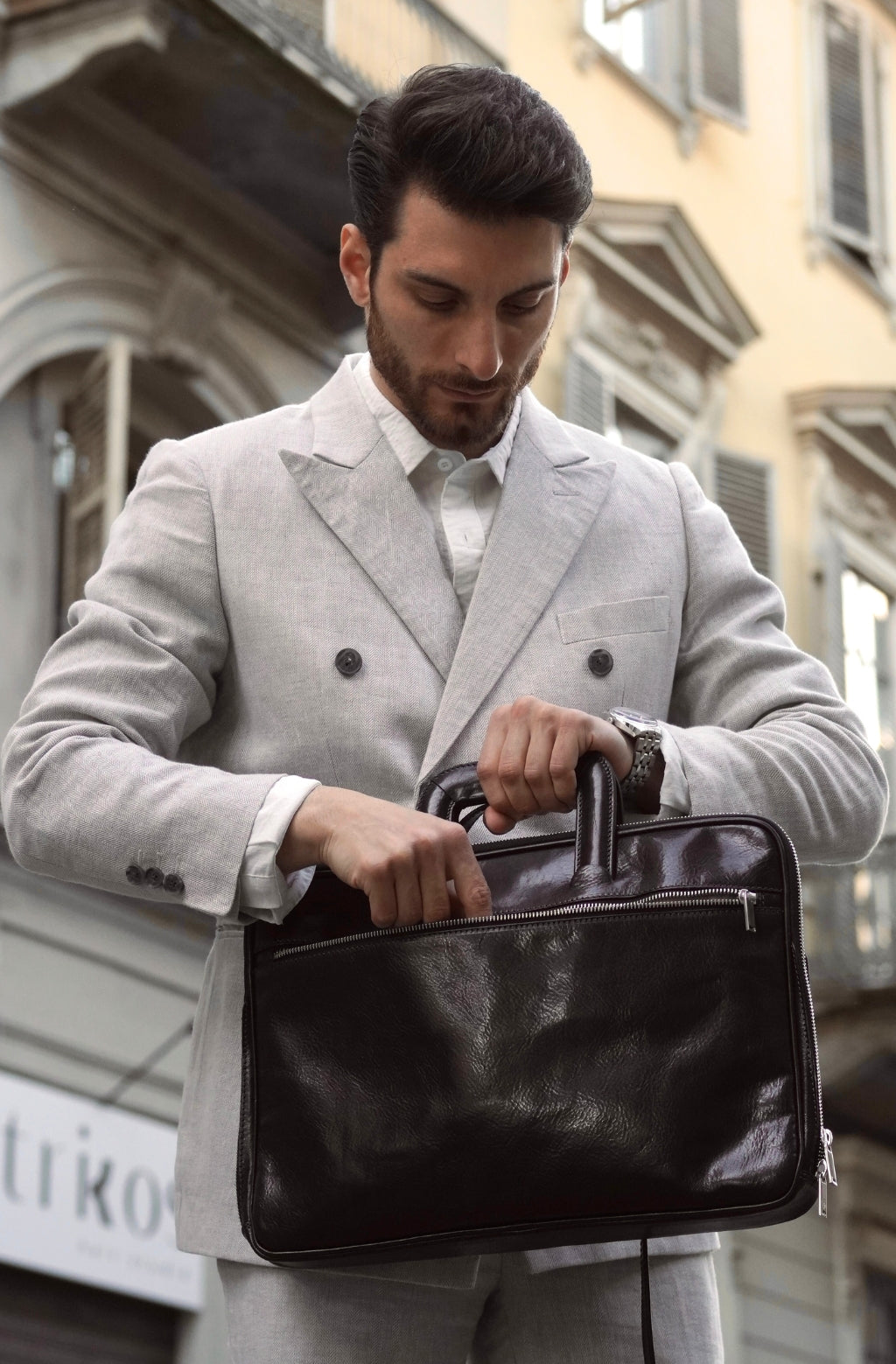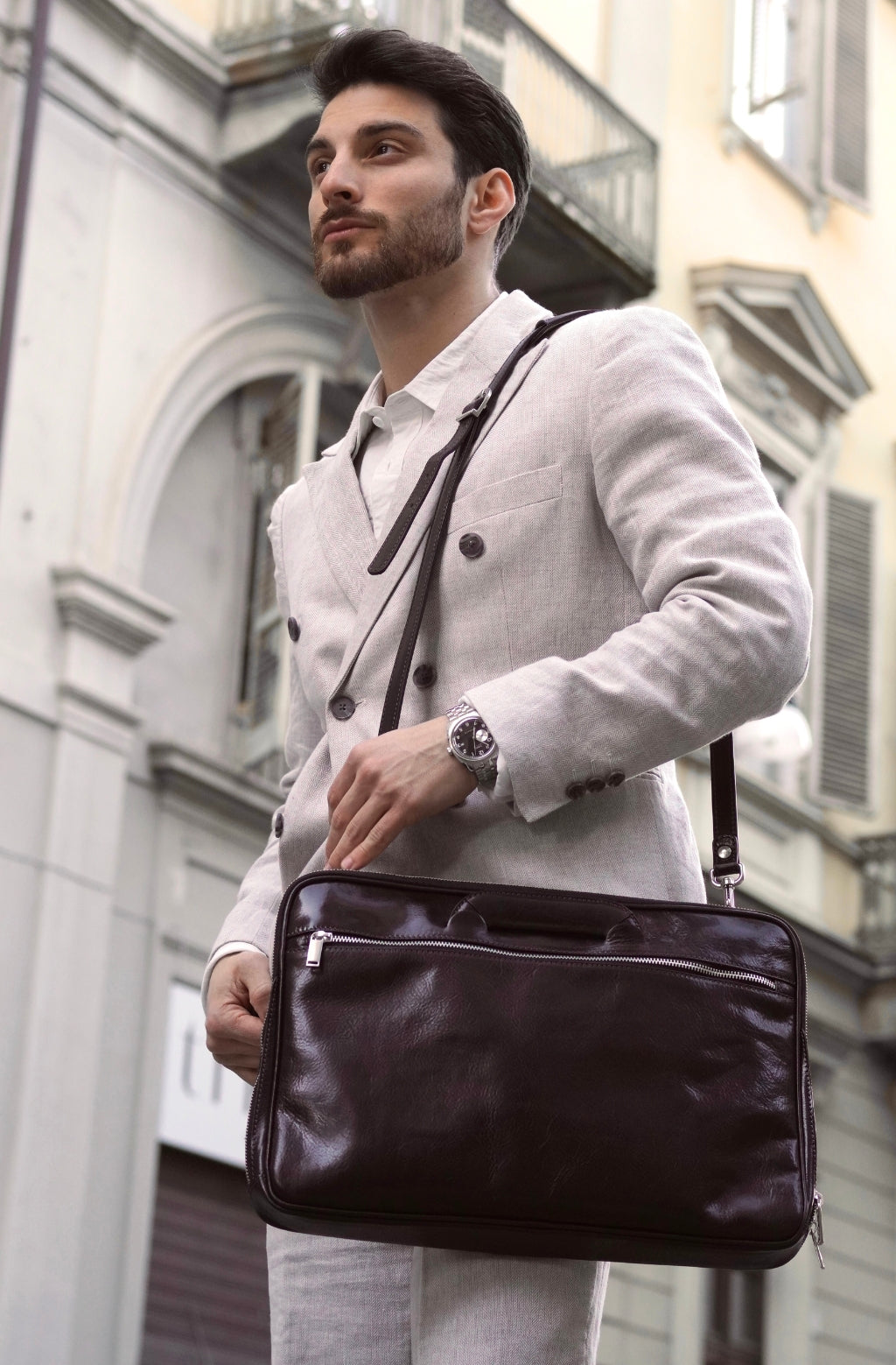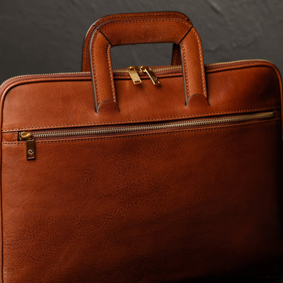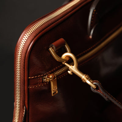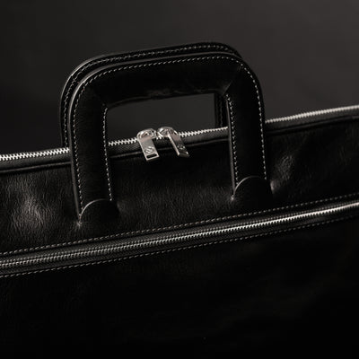 Un maletín de cuero de plena flor que expresa la perfecta armonía entre dureza y suavidad. El cuero de primera calidad teñido a mano le da un aire sentimental, pero las líneas transmiten un ligero toque de modernidad. Atemporal y actual. Masculino y femenino. Practicidad urbana con carisma.