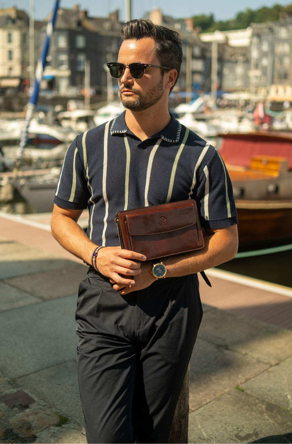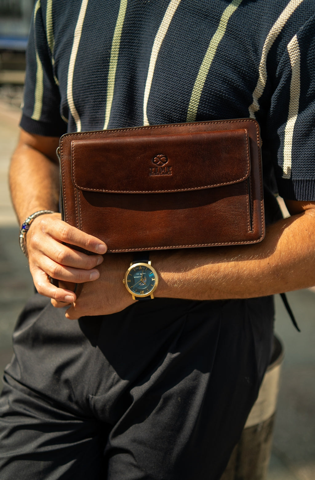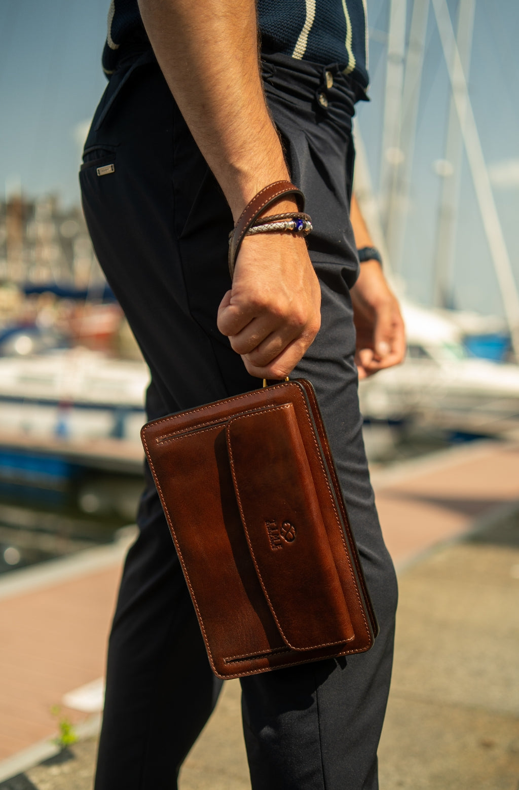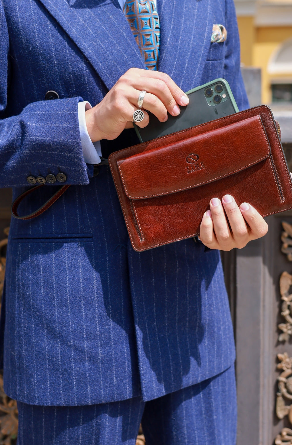 Una cartera de mano de cuero de diseño clásico y elegante es lo que siempre hemos querido añadir a nuestra colección. Combínelo con un atuendo de vestir o con unos vaqueros: complementará a la perfección ambas opciones. La cartera de mano Decameron de cuero italiano de plena flor es lo que necesita para mantener organizados sus objetos esenciales. Una cartera de mano de cuero de primera calidad con dos compartimentos, un bolsillo con cremallera interior y exterior, y un bolsillo frontal con cierre magnético que tiene lugar para guardar la cartera, el smartphone, las llaves, y más. Dispone de una correa de muñeca desmontable para poder transportarlo con facilidad: ideal para un día fuera de casa.