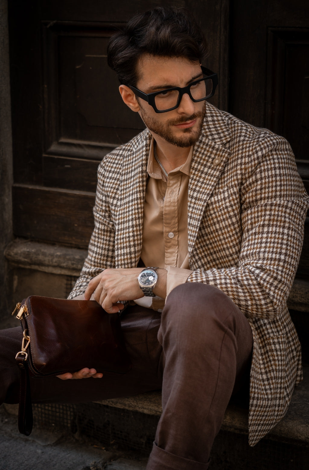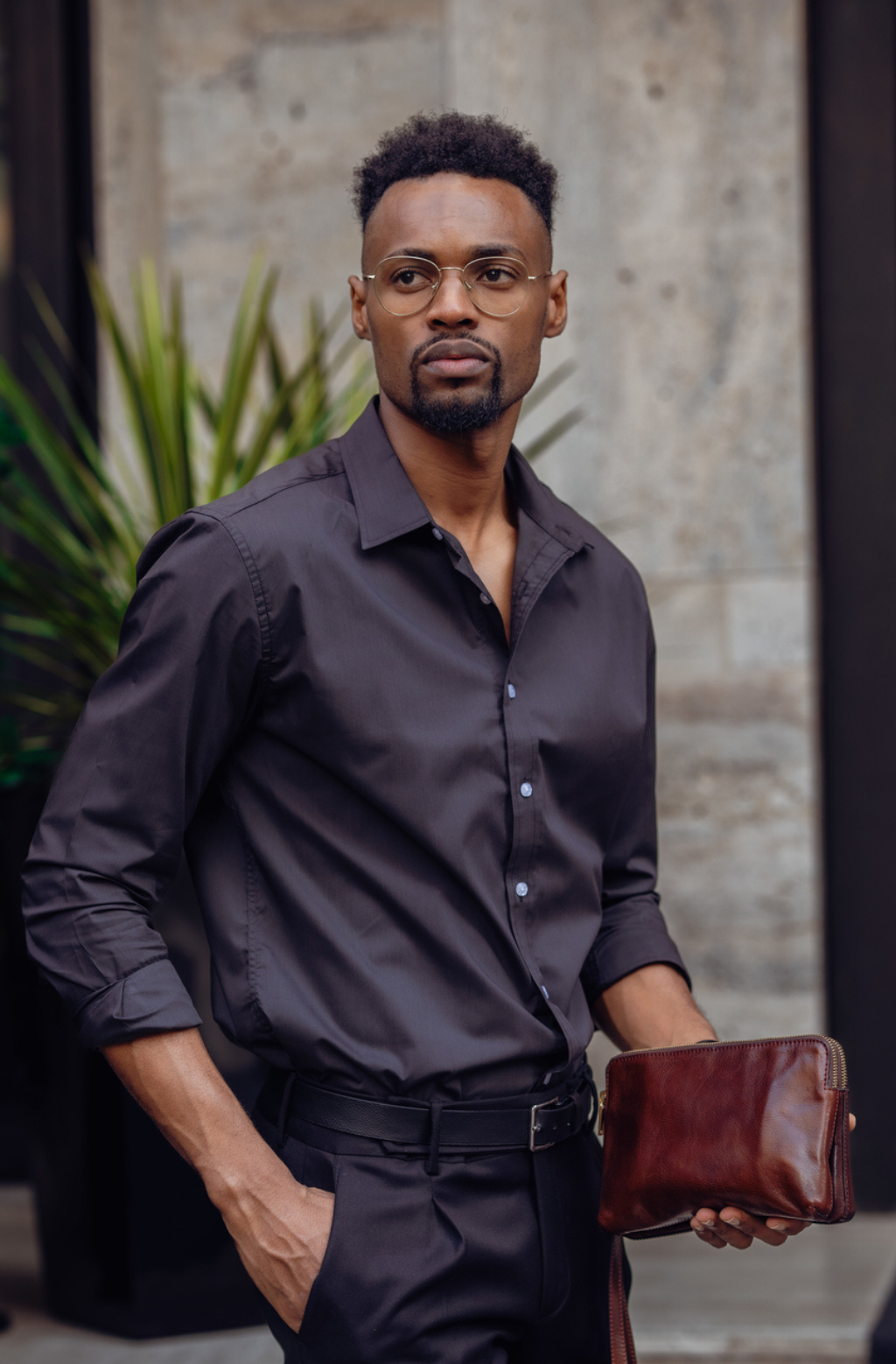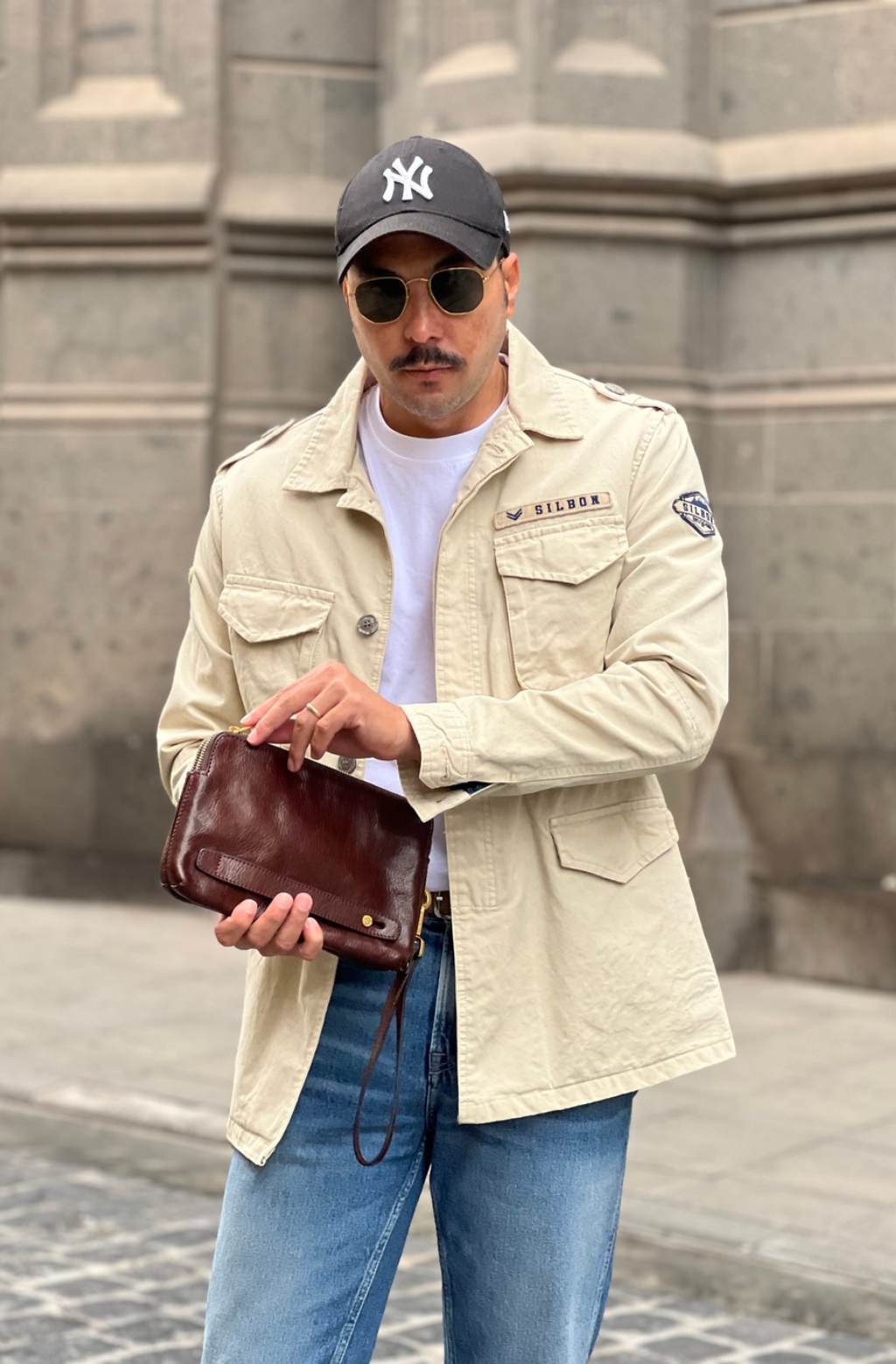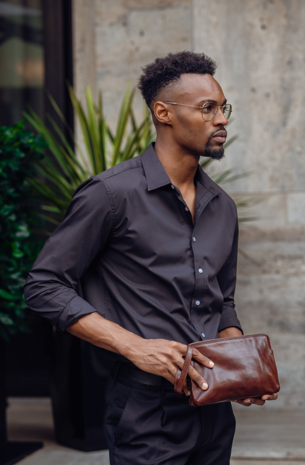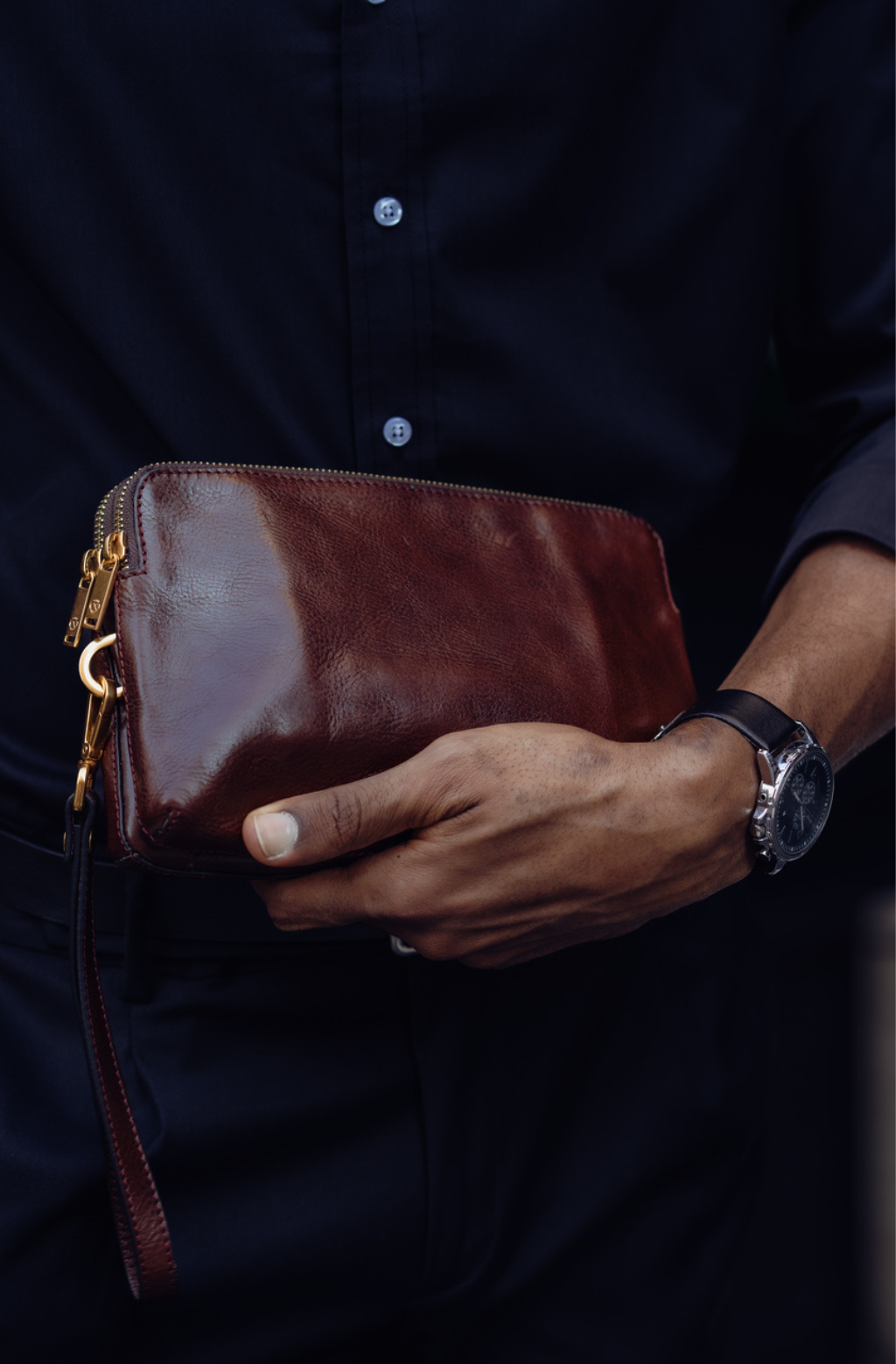 Una cartera de mano de cuero de plena flor para un hombre moderno, que no es partidario de llevar un bolso de hombro, pero que se ha dado cuenta de que el bulto de su cartera se le está yendo de las manos. Esta cartera de mano ofrece una alternativa más sofisticada a llevar toda la vida en una cartera abarrotada y en los bolsillos de la chaqueta. En él caben todos sus objetos de uso diario y luce un aspecto profesional con un toque de elegancia de sastrería.