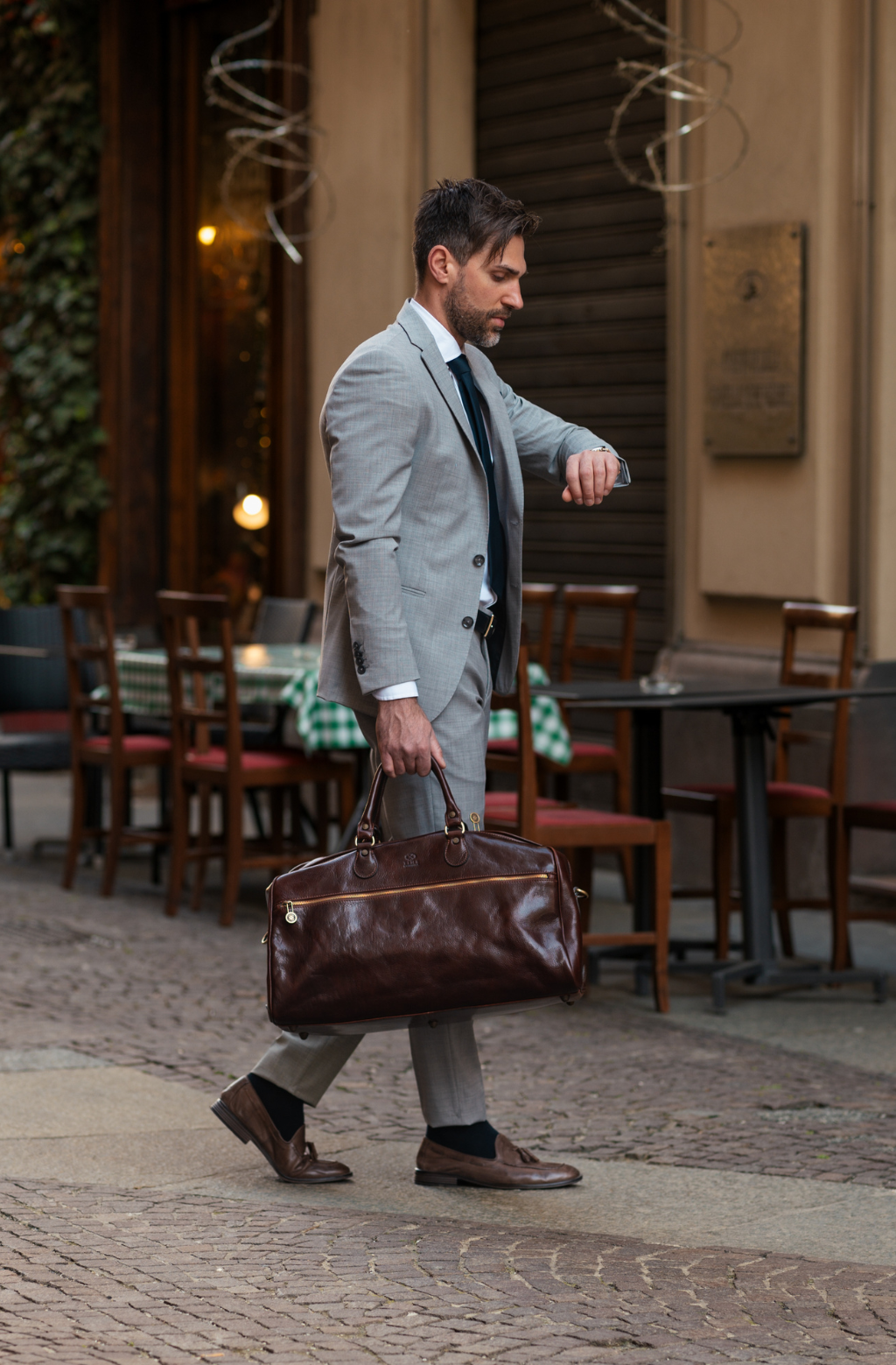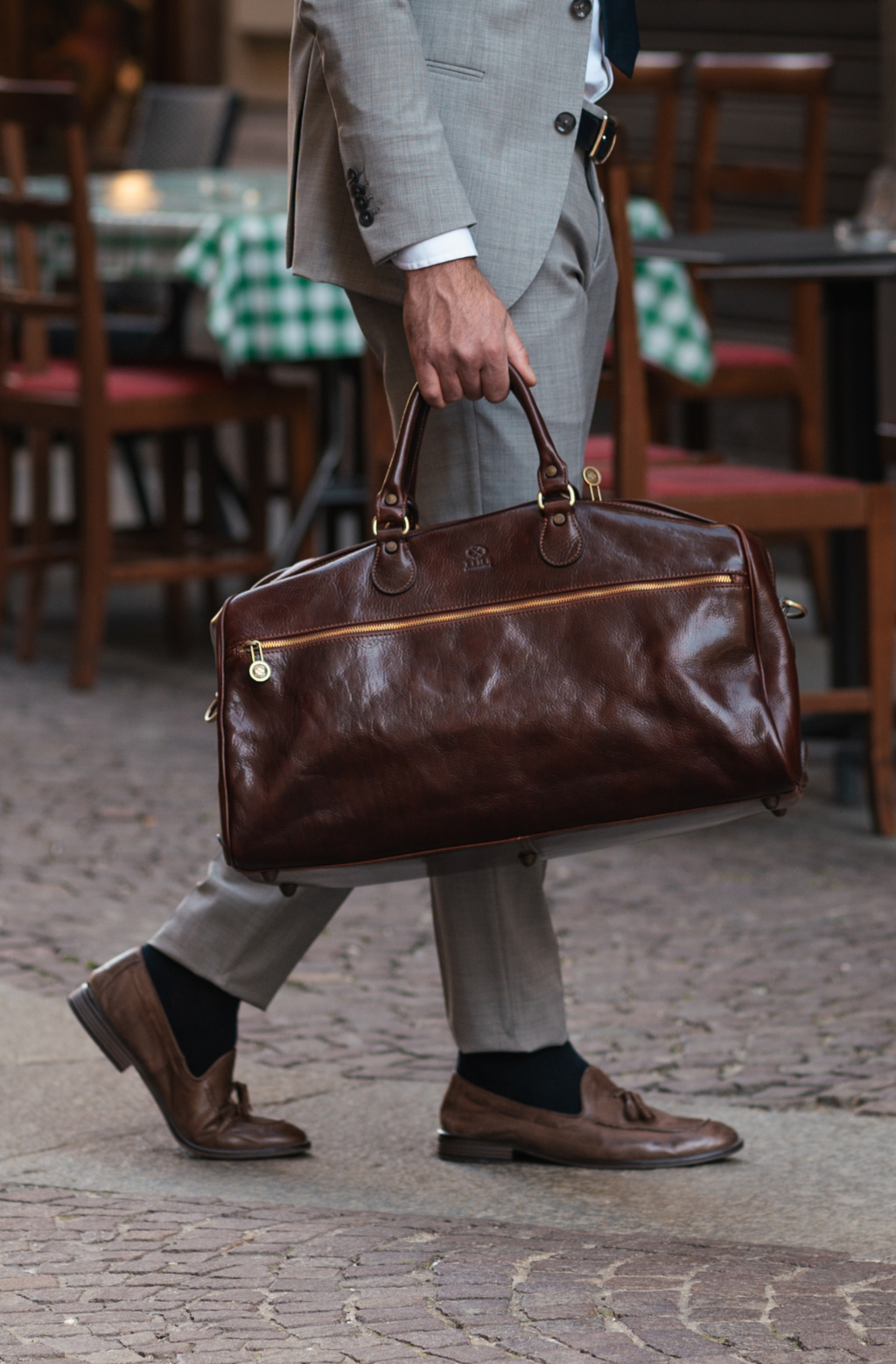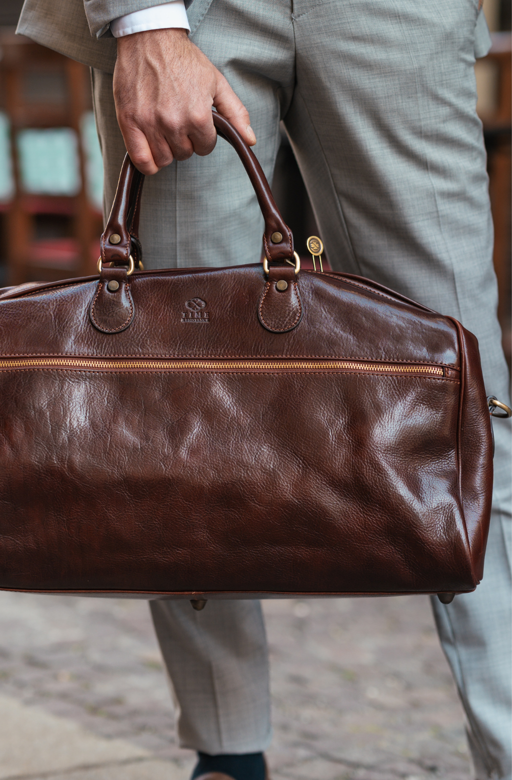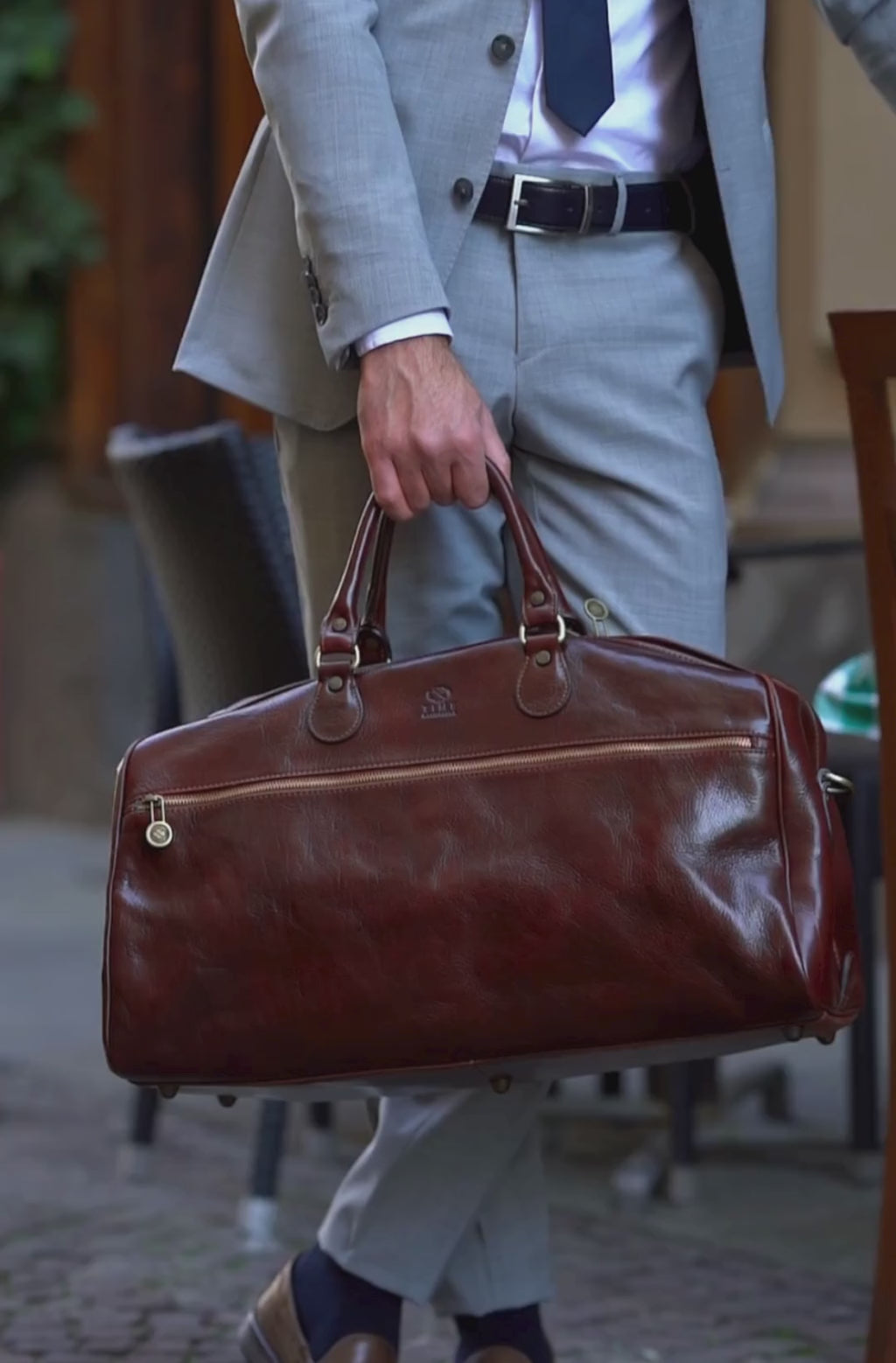 Una bolsa de viaje de cuero que combina el diseño de siempre con las necesidades de la vida moderna. Suficientemente espaciosa para acompañarle en una escapada de fin de semana, un viaje de negocios corto o para servir como bolsa de viaje cuando no está seguro de lo que le deparará la noche.