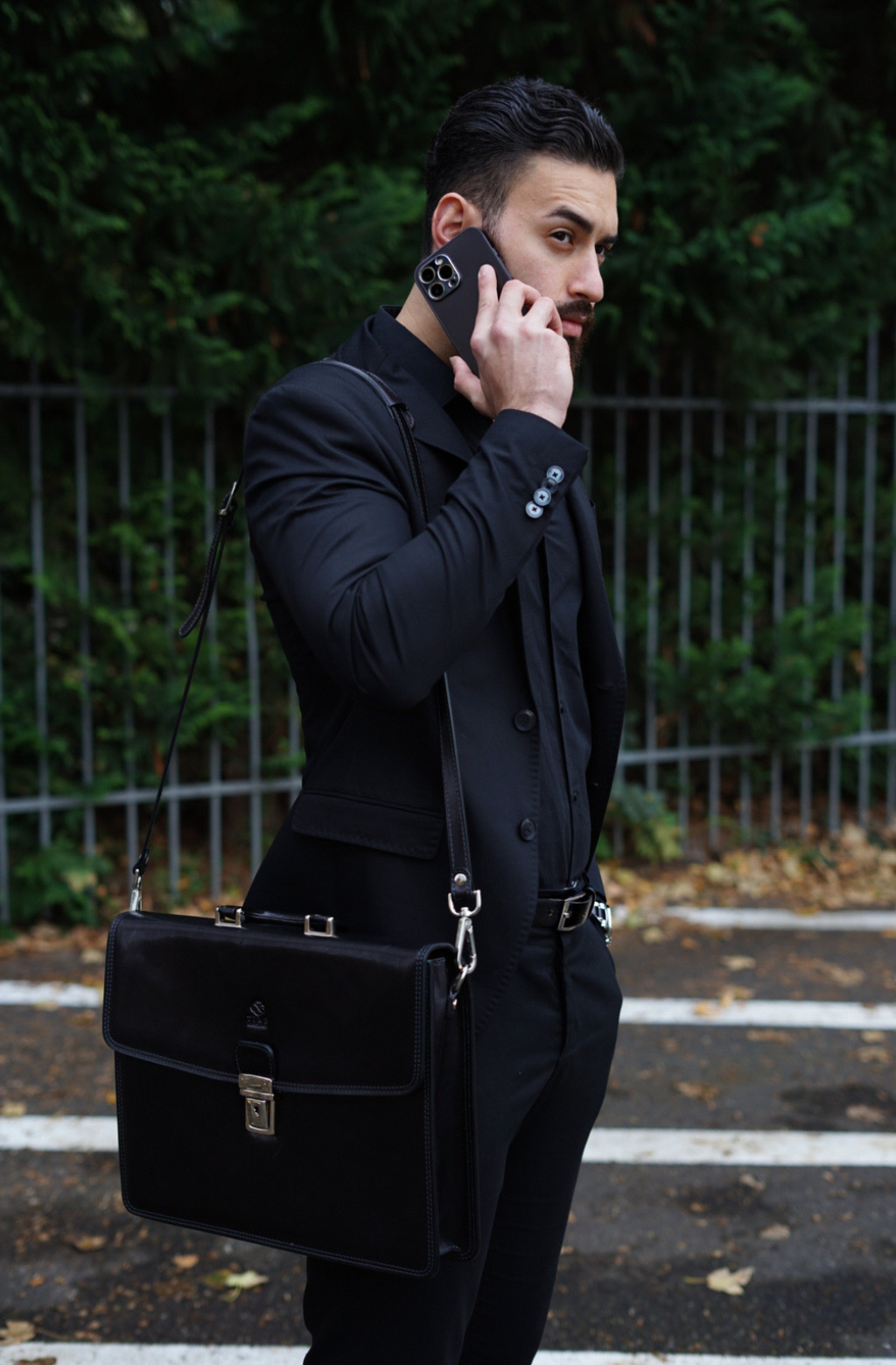 Un maletín de cuero clásico y discreto. Para cuando aún no ha decidido qué tipo de personaje va a interpretar en la vida. Combina con todo, lo que le da plena libertad para ser una persona hoy y todo lo contrario mañana: ¿un traje o una boina de lana? ¿Ambos? ¿Alguien usa ambos? ¿No? ¿Debería ser el primero? Complementado con imaginación.