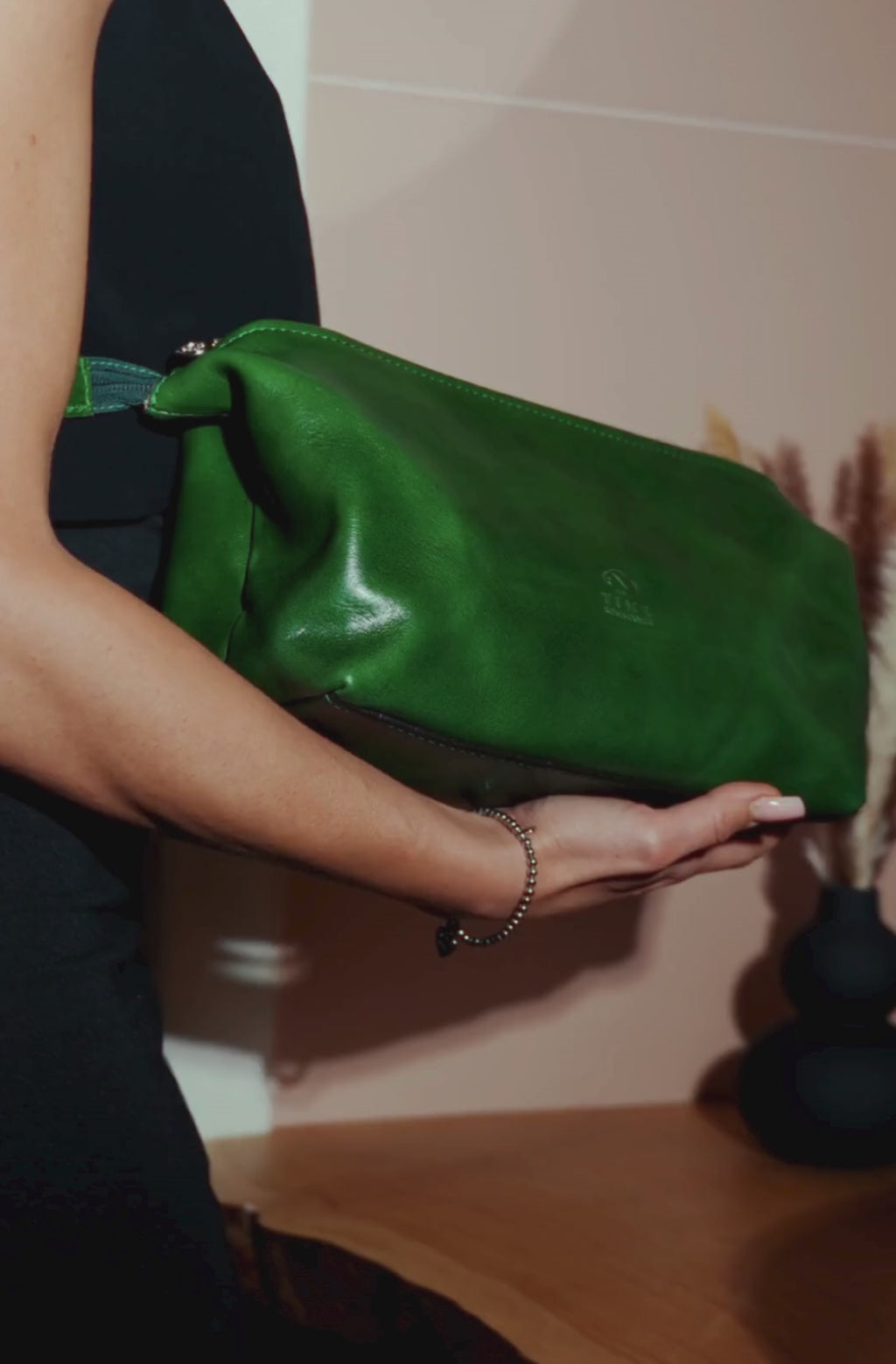 Un neceser de aseo de cuero de plena flor lo suficientemente espacioso como para que quepan todos sus artículos esenciales diarios, con un bolsillo interior y un reborde que permite una apertura total para un acceso cómodo.